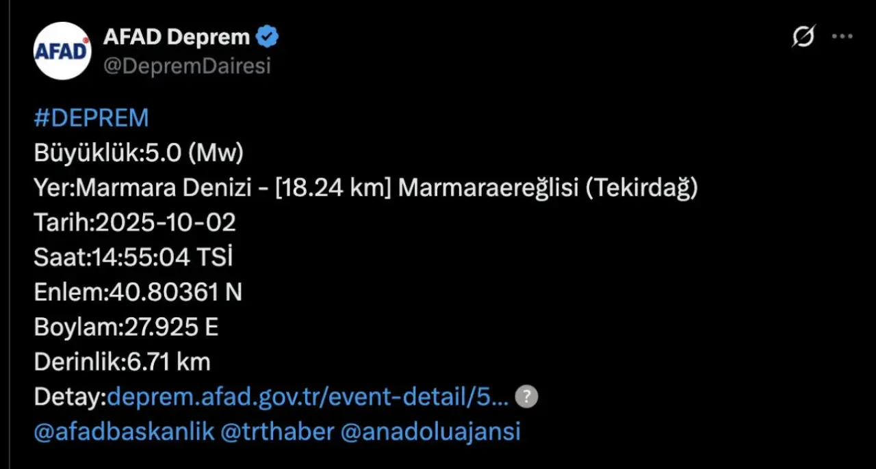 Depremin büyüklüğü, AFAD tarafından yapılan açıklamada 5.0 olarak duyuruldu. Marmara Denizi'nin Marmara Ereğlisi-Tekirdağ açıklarında saat 14.55'te gerçekleşen depremin derinliği ise 6.71 km olarak ölçüldü. Ayrıca, 14.58'de bölgede bir diğer küçük deprem daha meydana geldi; bu depremin büyüklüğü ise 3.8 olarak kaydedildi.