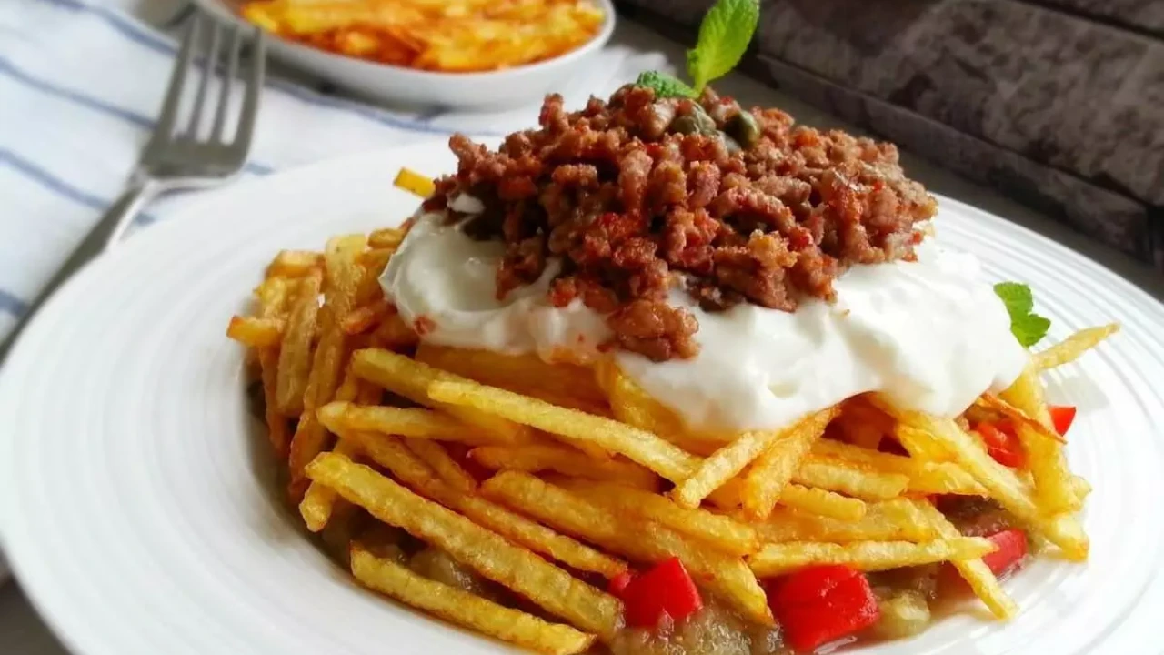 Üzerine yoğurt ve mayonez karışımını ekleyin ve ardından ince ince kızartılan patatesleri yerleştirin. Son dokunuş olarak maydanozla süsleyin.